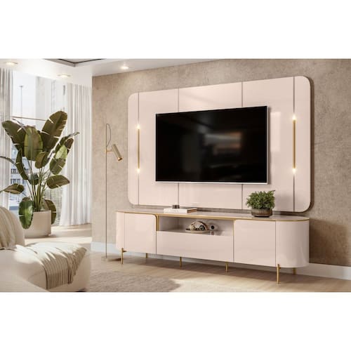 A Bancada e Painel Areta são um conjunto que vai ser o destaque da sua sala de estar, com uma estética contemporânea e muito elegante. O painel possui duas abas com charmosos cantos arredondados e que são iluminados por dois tubos metálicos dourados com LED, que abrilhantam e emolduram o amplo painel que abriga TV’s de até 75”, garantindo o melhor do entretenimento para sua família. A resistência do Painel é de até 40Kg, lembrando disso você consegue comprar a TV ideal para usar em conjunto com este móvel.