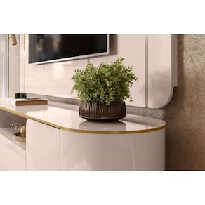A bancada conta com um tampo de cantos arredondados com bordas douradas que suporta TV’s de até 75”. A Bancada Areta conta com laterais arredondadas trazendo modernidade e exclusividade para o seu ambiente, duas portas com cantos curvos que se conectam com o painel e demais detalhes da bancada e uma gaveta ampla e prática, que possibilita assim uma organização mais prática. Os pés da bancada são em metal cilíndrico dourado, que além de serem resistentes trazem uma sofisticação a mais ao produto. Para dispor seus aparelhos eletrônicos, conte com um nicho central na bancada.