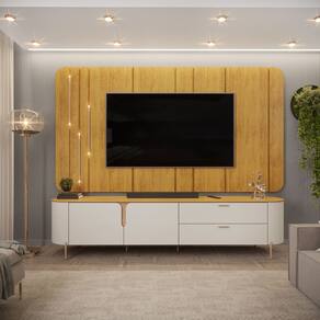 O Rack com Painel Celine é a escolha elegante para a sala de estar. O Rack possui laterais curvas, tampo usinado, portas de giro e gavetas com detalhes curvos, adicionando sofisticação. Com passa-fios para organização dos cabos e pés metálicos cilíndricos para facilitar a limpeza e aumentar a durabilidade. O painel apresenta cantos arredondados, divisões com bordas chanfradas, espaço para TVs de até 75" e luminárias para um toque extra de elegância. Com resistência de até 40Kg, permite a escolha da TV ideal. Ambos são 100% em MDF de reflorestamento, garantindo durabilidade e respeito ao meio ambiente. O Rack com Painel Celine oferece benefícios e sofisticação, tornando seu lar mais aconchegante. Aproveite para destacar sua casa com esses produtos excepcionais.