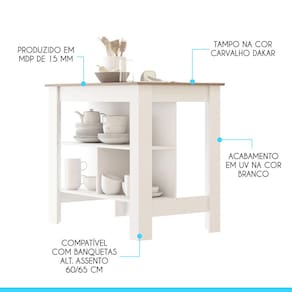 A Bancada de Cozinha foi desenvolvida para atender todas as suas necessidades do dia a dia, otimizando seu ambiente com versatilidade, conforto e beleza. Dispõe de um design atual inspirado nas cozinhas americanas. O charme fica por conta da facilidade de ter todos os seus utensílios a mão de um lado e espaço para banquetas do outro, transformando os momentos em família. Produzida com materiais de excelente qualidade, garantindo a sua durabilidade e vida útil. O melhor em móveis no design atual aliando conforto, qualidade e ótimos preços, só na Menu Móveis! CARACTERÍSTICAS TÉCNICAS: - Produzido em MDP de 15 mm - Acabamento UV na cor Branco - Tampo na cor Carvalho Dakar INFORMAÇÕES TÉCNICAS: Altura: 92,5 Cm Largura: 103 Cm Profundidade: 68 Cm INFORMAÇÕES ADICIONAIS: *ATENÇÃO: Não trabalhamos e não nos responsabilizamos pela montagem do móvel. Antes da montagem conferir se o produto está de acordo com o que comprou, produto montado e danificado pela montagem não será aceito troca. Montagem e instalação por conta do comprador. **As imagens ambientadas são meramente ilustrativas e podem apresentar itens que não compõe o produto. As cores do produto podem variar de acordo com o monitor, a iluminação do ambiente ou sua percepção visual. ***Limpeza: Deve ser feita com pano macio e seco ou levemente umedecido com água e sabão neutro. Não devem ser utilizados abrasivos como palha de aço e objetos cortantes. Garantia para defeitos de fabricação conforme Código de Defesa do Consumidor. Ean: 7805295030564 Ean: 7805295030564