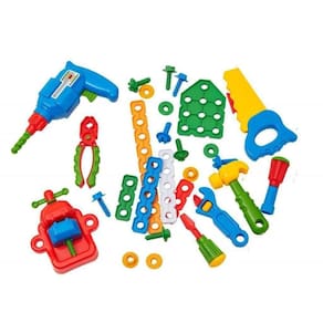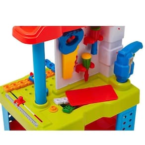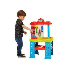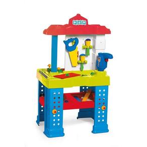 Uma bancada com duas frentes de trabalho colorida e equipada com diversas ferramentas e acessórios. A brincadeira será montar e desmontar, parafusar e soltar parafusos e o que mais a imaginação quiser!