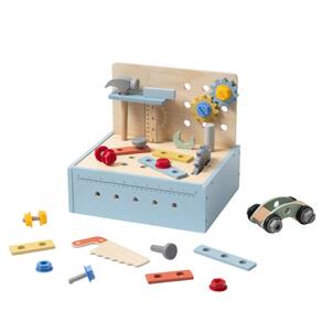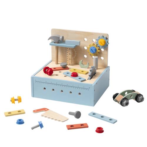 COMPOSIÇÃO: 43 peças Feito em madeira Tamanho da Bancada montada (C x L x A): 30 x 25,5 x 27cm - A bancada também pode ser utilizada como uma maleta de transporte, com todas as suas peças dentro, totalmente fechada como uma caixa, e com alça para segurar.