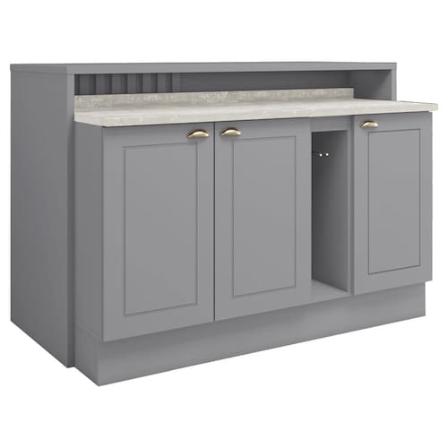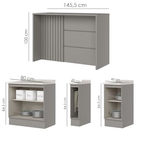 No conceito inspirado nas cozinhas estilo americano. Um conjunto modular de cozinha sendo 7 peças: 1 balcão de 80 cm (com tampo de 80 cm), 1 balcão de 40 cm (com tampo de 40 cm), 1 balcão de 20 cm (com tampo de 20 cm) e 1 Bancada gourmet de 145,5 cm. Todo o conjunto com estrutura feita 100% MDF de 15mm (fundo com 3mm, tampo em MDP de 25mm) , portas com dobradiças metálicas 35 mm com amortecimento e fechamento suave, total de 2 prateleiras espaçosas suportando até 8 kg. Cozinha com acabamento em pintura UV texturizada (fosco), portas e gavetas com detalhes de usinagem em baixo relevo, que proporciona beleza e facilidade ao limpar, além do destaque em seus puxadores em metal zamac. Este móvel chegará na sua casa separado em 07 volumes.