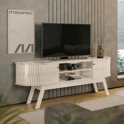 Esse Rack é perfeito para o seu ambiente, contém deltahes curvos no tampo e na base garantindo a elegância para a sua sala. Testado para TVs de 75 polegadas.