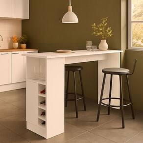 Seu diferencial está na lateral funcional, equipada com nichos que funcionam como adega e espaço para taças ou utensílios, além de um armário discreto para armazenar o que for necessário no dia a dia. Fabricada em estrutura 100% MDP, com acabamento branco e linhas retas, ela se adapta facilmente a ambientes contemporâneos.