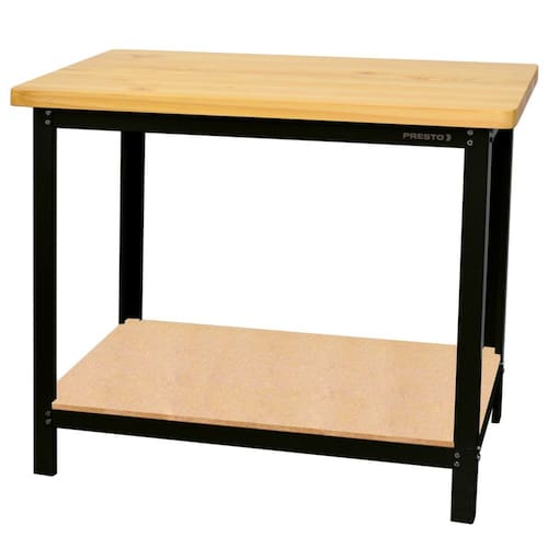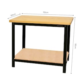 Tampo superior em pinus maciço 40 mm e inferior em MDP 15 mm de espessura. É possível personalizar a bancada, adquirindo o Tampo em aço galvanizado 1,10 m (código 91514) e/ ou 1 gaveta (código 91520), ambos são acessórios e não acompanham este produto.