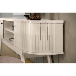 O modelo conta com 2 portas de correr usinadas, com ripados decorativos usinados que valorizam o visual do ambiente. Internamente, possui compartimentos espaçosos e prateleira, ideais para organizar aparelhos, objetos e acessórios.