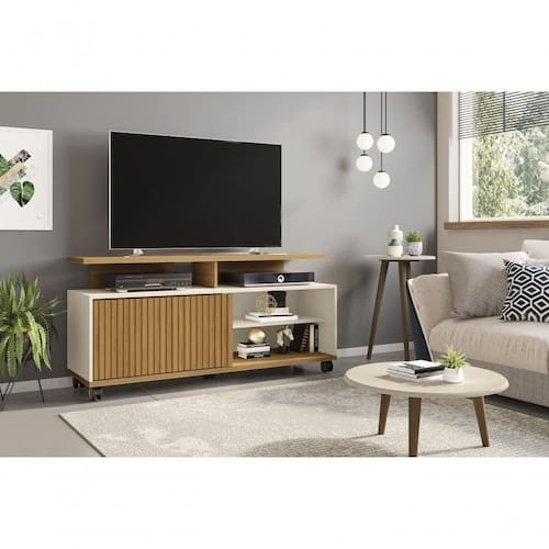 Com design retrô e moderno ao mesmo tempo, conta com 1 porta, 3 nichos e 2 prateleiras, que oferecem espaços ideais para aparelhos e decoração.