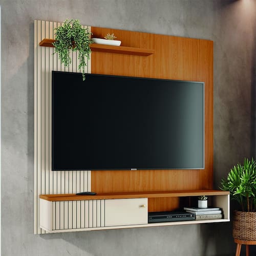 Características: Estrutura em MDP Pintura semi brilho Porta Deslizante em MDF Puxador de Plástico Prateleira superior com borda frontal chanfrada Produto deve ser fixado na parede Espaço para TV até 65 Polegadas.
