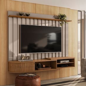 Características: Estrutura em MDP Pintura semi brilho Portas deslizantes em MDF Puxadores de Plástico Produto deve ser fixado na parede TV deve ser fixada no painel Tampo e base com detalhes curvos Espaço para TV até 75 Polegadas.