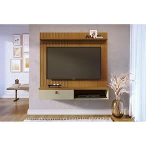 Desenvolvida para ser fixada diretamente na parede, a bancada Íris oferece uma solução funcional e estilosa para organização do ambiente. O televisor deve ser instalado no painel integrado, e o móvel suporta TVs de até 55", sendo ideal para espaços compactos e modernos.