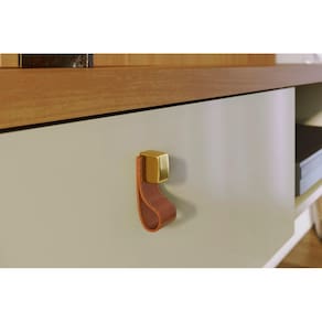 O puxador com acabamento dourado fosco e revestimento que simula couro natural é um detalhe refinado que enriquece o visual da bancada. A prateleira superior com borda chanfrada complementa o design moderno, enquanto a estrutura em painéis de MDP de 12, 15 e 25 mm garante resistência e durabilidade.
