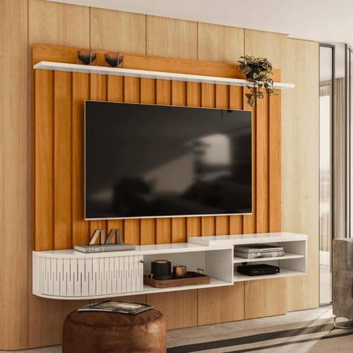 Esse Home é perfeito para o seu ambiente, contém deltalhes ripados e curvo no tampo e na base garantindo a elegância para a sua sala. Testado para TVs de 75 polegadas.