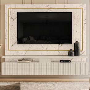 Esse Home é perfeito para o seu ambiente, o painel contém detalhes ripados e Fitas de LED garantindo a elegância para a sua sala. Testado para TVs de 75 polegadas.