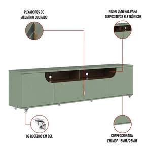 Transforme seu espaço de convivência com a elegância e funcionalidade da Bancada Karol. Com uma estrutura robusta e sofisticada, esta peça é confeccionada em MDP 15mm, MDP 25mm e HDF 3mm, garantindo durabilidade e qualidade excepcionais. A pintura UV na envolvente cor Verde Pistache/Amêndoa adiciona um toque de charme a qualquer ambiente. As duas portas com usinagem curva e as duas portas com puxadores de alumínio dourado e design curvo destacam-se pelo requinte e pela atenção aos detalhes. As dobradiças metálicas proporcionam um fechamento suave e seguro, garantindo praticidade no dia a dia. A Bancada Karol apresenta um nicho central perfeito para organizar seus dispositivos eletrônicos, enquanto o amplo tampo de 25mm oferece espaço suficiente para acomodar uma TV de até 75 polegadas com elegância e estabilidade. Os rodízios em gel conferem mobilidade à peça, facilitando sua movimentação e ajuste no ambiente conforme necessário. Seja na sala de estar, no quarto ou em qualquer outro espaço, a Bancada Karol é a escolha ideal para quem busca estilo, qualidade e funcionalidade em um único móvel. Adicione um toque de sofisticação ao seu ambiente com esta deslumbrante bancada!