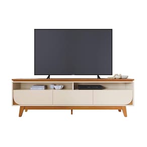 Três gavetas com corrediças telescópicas, gavetas laterais com detalhe curvo, tampo da TV suspenso em 25mm com borda chanfrada, pés usinados, painéis em MDP de 15 e 25mm.