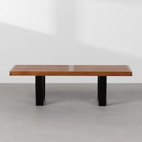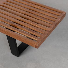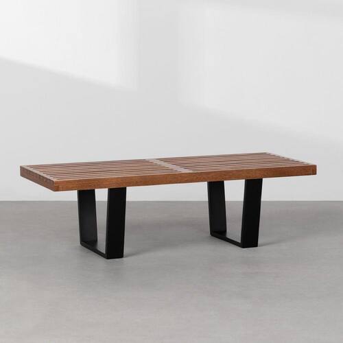 Características Principais: • Design ripado; • Assento em madeira de eucalipto na cor Nozes/Verniz; • Base em madeira de eucalipto na cor Preto/Verniz; • Suporta até 160kg; • Medidas do Produto: Altura: 34,8cm | Comprimento: 114cm | Largura: 45,5cm.