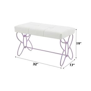Banco Acme Priya II tapizado con tubo metálico en blanco y lila claro. - Acabado: Blanco y lila claro - Material: MDF, acabado de alto brillo, tubo metálico, PU y espuma retardante de fuego (esponja) - Asiento acolchonado capitoné - Base: 2 paneles metálicos con diseño mariposa - Soporte transversal - Tubo metálico: recubrimiento en polvo color lila