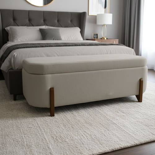 Este banco baú une estilo, praticidade e conforto em um único móvel. Perfeito para ser utilizado como peseira de cama, banco de apoio ou organizador, ele oferece um design sofisticado em tecido estofado e pés de madeira, que agregam charme e elegância ao ambiente.