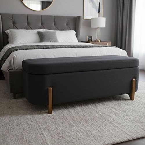 Este banco baú une estilo, praticidade e conforto em um único móvel. Perfeito para ser utilizado como peseira de cama, banco de apoio ou organizador, ele oferece um design sofisticado em tecido estofado e pés de madeira, que agregam charme e elegância ao ambiente.