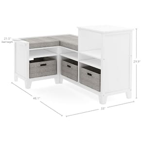 Marca: Martha Stewart? Fabricante: Guidecraft? Modelo: Martha Stewart Living & Learning Kids’ Corner Nook – Linen White (B08P7KC1V5)? Cor: Branco Linen White? Faixa etária recomendada: A partir de 5 anos? Material: Madeira de bétula e madeira engenheirada? Tipo de produto: Banco de canto infantil com prateleiras, nichos e assento acolchoado? Formato: Canto (Corner Nook), estrutura retangular em L? Número de prateleiras: Múltiplas prateleiras abertas para livros e objetos? Número de compartimentos com cestos: 3 nichos com cestos de tecido? Cestos inclusos: 3 cestos de tecido? Dimensões do produto (L x P x A): 122 cm x 84 cm x 76 cm? Altura do assento: 55 cm? Peso do produto: 49kg? Capacidade máxima de peso: 91kg? Tipo de montagem: Piso (freestanding)? Ambiente de uso indicado: Quarto infantil e brinquedoteca? Acabamento: Superfície branca de fácil limpeza? Cuidados de limpeza: Limpar com pano seco? Conteúdo da caixa: 1 banco de canto infantil Martha Stewart Living & Learning, 1 assento acolchoado e 3 cestos de tecido? Requer montagem: Sim, montagem pelo usuário adulto? Manual do usuário: Inglês Marca: Não Informado