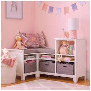 O banco de canto infantil Martha Stewart Living & Learning foi desenvolvido para criar um espaço de leitura e descanso em quartos infantis e brinquedotecas, aproveitando cantos do ambiente com uma solução de assento e armazenamento integrados. A estrutura em formato de canto oferece prateleiras e nichos para acomodar livros, brinquedos e materiais de uso diário, mantendo os itens ao alcance das crianças a partir de 5 anos.?