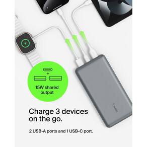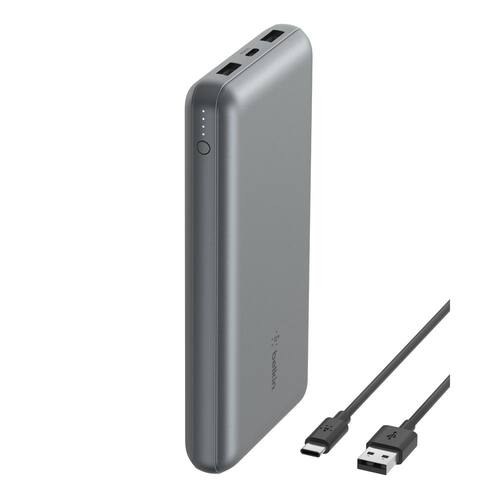 Belkin Power Bank, carregador portátil BoostCharge USB-C de 20k com 1 porta USB-C e 2 portas USB-A com cabo USB-C para USB-A para iPhone 15, 15 Plus, 15 Pro, 15 Pro Max, Samsung Galaxy S24 e mais - cinza - 3 portas para carregamento conveniente: este banco de energia BoostCharge permite carregar simultaneamente até 3 dispositivos com uma porta USB-C e 2 portas USB-A. Obtenha uma cobrança confiável em seu iPhone ou Android. - CABO DE ALTA CAPACIDADE E INCLUÍDO: pré-carregado e pronto para uso, com 20.000 mAh de energia, fornecendo 78 horas adicionais de duração da bateria para seu smartphone. Um cabo USB-C para USB-A de 6 polegadas está incluído para que você possa começar a carregar dispositivos compatíveis imediatamente! - CONFORMIDADE VERSÁTIL COM PD: O Power Bank de 3 portas BoostCharge pode carregar 2 dispositivos via USB-C de 15 W no máximo compartilhado e outro dispositivo via saída USB-A de 12 W no máximo, fornecendo carregamento simultâneo para smartphones e tablets. - LUZ INDICADORA LED: Este banco de energia Belkin foi projetado com uma luz LED embutida que informa o status do banco de energia, para que você sempre saiba quando é hora de recarregar. - FIQUE PROTEGIDO: obtenha uma carga segura e poderosa para seus dispositivos com proteção contra sobrecarga para garantir qualidade e compatibilidade, e mantenha a tranquilidade, pois ele vem com uma garantia de 2 anos e CEW (Garantia de Equipamento Conectado) de até $2.500.