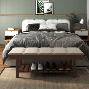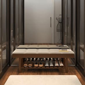 O Banco Em Madeira Almofadado Com Sapateira combina praticidade e conforto. Seu design permite que você armazene sapatos enquanto aproveita o banco almofadado para conforto adicional.