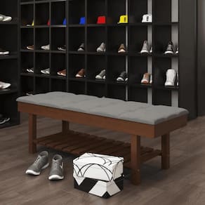 O Banco Em Madeira Almofadado Com Sapateira é perfeito para quem busca um banco funcional com espaço para guardar sapatos. O almofadado oferece conforto extra para usar como apoio.
