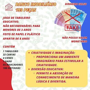 Conteúdo da embalagem: - 1 jogo de tabuleiro Banco Imobiliário, contendo: - 1 tabuleiro - 32 cartas - 4 cones - 1 dado - 55 marcadores - 100 notinhas