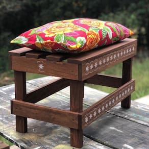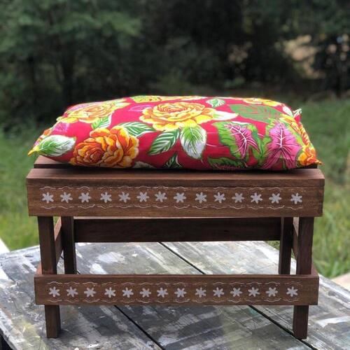 Lindo banquinho, feito de madeira maciça reaproveitada (pallet), ou de reflorestamento. . Acabamento envelhecido em tom canela, encerado, e decorado artesanalmenteAcompanha uma almofada floral.Super reforçado!!Decoração Sustentável: Ajude a preservar a Natureza!!!É entregue MONTADOAltura: 0.30 cmLargura: 0.30 cmComprimento: 0.50 cmPeso: 5000 g