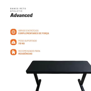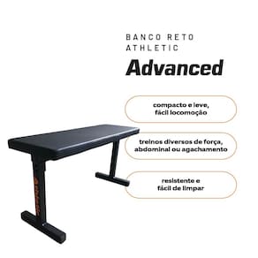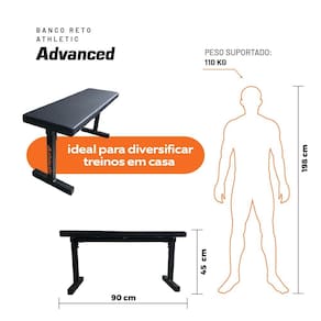 Banco reto Athletic Advanced Estrutura metálica Estofamento com espuma Revestimento sintético Capacidade de até 110 kg Dimensões compactas