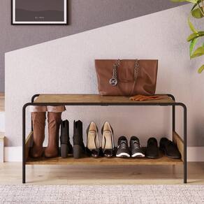 Características - Carvalho/Preto - Estrutura: Pés metálico/Tampo em MDP 15 mm - Acabamento/Revestimento: Pintura Epóxi/ Pintura BP - 1 Banco sapateira com 1 prateleira - Peso Suportado: Tampo 100 kg/ 7 kg na prateleira - Produto entregue desmontado - Marca: Artesano