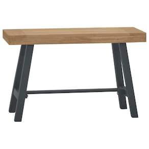 -?Toque rústico?: Um acabamento rústico no banco de teca marrom contrasta facilmente com as pernas pintadas de preto para um apelo chique em sua sala de estar ou escritório
