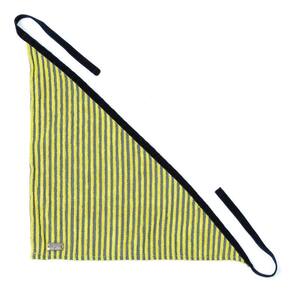 A Bandana Mila é feita em modelagem triângulo em tecido especial com listras em Chenille e amarração com fita de veludo francesa dupla face.