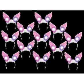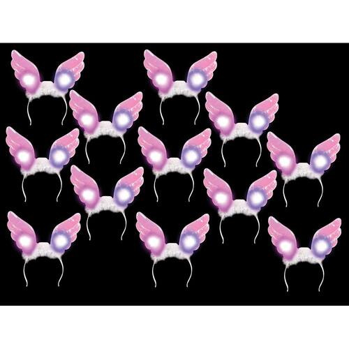 Este item é vendido em caixas de: [12] itens. Obtenha suas asas. Essas bandanas luminosas apresentam asas de anjo rosa embelezadas por uma variedade de peles e enfeites. Pressione um botão para acender uma série cintilante de luzes intermitentes. Baterias incluídas. Cada peça em saco plástico com cabeçalho impresso. Vendido às dúzias.