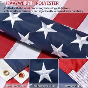 -?Estrelas bordadas requintadas, artesanato especializado?Cada estrela é bordada individualmente com precisão de costura dupla para uma aparência polida. As bordas da bandeira são reforçadas com quatro fileiras de costura e costura dupla para resistir ao desgaste e ao rasgo.