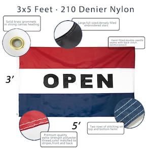 Esta bandeira aberta resistente é feita de material de nylon durável para ajudar a resistir aos ambientes externos com vento. Não compre uma bandeira de poliéster fino como papel que será arrancada em uma semana! Você apreciará plenamente o acabamento e a qualidade desta bandeira.