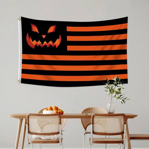 Material: poliéster (pongee) Tamanho: 150 cm × 90 cm Peso: 120 g Feito de tecido de poliéster durável, adequado para uso interno e externo. Apresenta um design exclusivo com listras pretas e laranja e um rosto assustador de abóbora para uma atmosfera festiva de Halloween. Com tamanho de 90 x 150 cm, ideal para pendurar em festas de Halloween, casas mal-assombradas ou em seu quintal. Ilhós incluídos para facilitar a suspensão; nenhum mastro é fornecido. Uma decoração perfeita para dar um toque assustador e divertido às suas celebrações de Halloween.