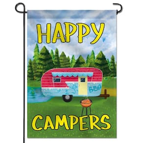 - Especificações - Importado. Feito de 100% poliéster. O pacote contém uma bandeira de jardim Anley Happy Campers de 18 x 12,5 polegadas, com manga larga de 1 polegada. Mastro de bandeira não incluído.