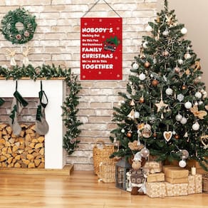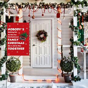 Decoração de Natal hilária: a divertida bandeira do jardim de Natal é adornada com cenas e personagens das férias de Natal, adicionando um toque de humor e espírito festivo à sua decoração externa.