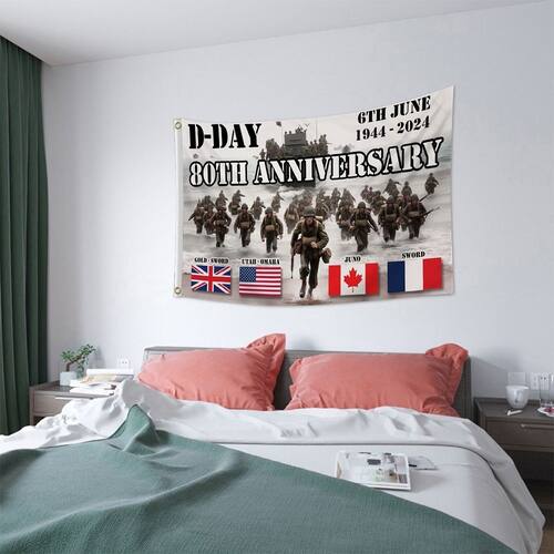 Material: poliéster (pongee) Tamanho: 150 cm × 90 cm Peso: 120 g Material de qualidade premium: feita de 100% poliéster durável, esta bandeira foi projetada para durar, mantendo cores vivas para exibição interna e externa. Design histórico: apresenta imagens icônicas de soldados desembarcando no Dia D, ao lado das bandeiras do Reino Unido, EUA, Canadá e França, marcando o 80º aniversário. Comemorativo: Perfeito para lembrar a bravura dos soldados durante a Segunda Guerra Mundial, com a frase “80º ANIVERSÁRIO DO DIA D” e a data significativa de 6 de junho de 1944. Tamanho ideal: mede 150 cm x 90 cm, perfeito para exibição em eventos, memoriais e fins educacionais ou para homenagear veteranos. Fácil de exibir: vem com bordas e ilhós reforçados, facilitando a suspensão e a exibição; sem poste incluído.