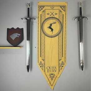 Adicione um toque de nobreza e autenticidade à sua coleção com esta bandeira flâmula da Casa Baratheon de Game of Thrones. Feita em Tactel de alta qualidade, esta bandeira apresenta o brasão distintivo da Casa Baratheon em uma dimensão de 150cm de comprimento e 48cm de largura.