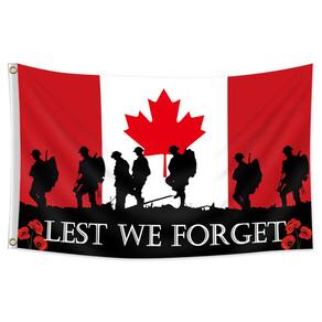 Material: poliéster (pongee) Tamanho: 150 cm × 90 cm Peso: 120 g Material de alta qualidade: feito de 100% poliéster durável, projetado para resistir a elementos externos, mantendo suas cores vivas em ambientes internos ou externos. Design patriótico: apresenta imagens poderosas de soldados em silhueta em frente à icônica bandeira canadense de folhas de ácer, junto com papoulas e a frase “PARA QUE NÃO ESQUEÇAMOS”. Tamanho perfeito: medindo 150 cm x 90 cm, é ideal para exibição em jardins, em eventos memoriais ou em sua casa como uma homenagem aos veteranos. Resistente às intempéries: esta bandeira é feita para resistir às intempéries, garantindo um uso duradouro sem desbotamento ou danos, mesmo quando exibida ao ar livre. Fácil de pendurar: equipado com bordas e ilhós reforçados, facilitando a suspensão e a exibição com ou sem um poste; nenhum poste incluído.