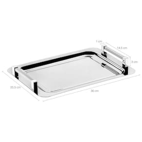 A bandeja de aço inox pequena com alças da Zanella é uma opção funcional e estilosa para servir cafézinho, lanches e outros alimentos em diferentes contextos. Sua durabilidade, design prático e elegante fazem dela uma excelente escolha para quem busca praticidade e sofisticação na hora de servir. Feita de inox, a bandeja é conhecida por sua alta resistência à corrosão, durabilidade e facilidade de limpeza. O material também confere um aspecto moderno e sofisticado, tornando-a adequada para uso tanto em ambientes domésticos quanto em estabelecimentos comerciais, como cafés, restaurantes ou lanchonetes. A presença de alças nas extremidades da bandeja facilita o transporte, permitindo que você sirva os lanches e bebidas com facilidade e segurança. A superfície lisa da bandeja proporciona uma apresentação elegante dos alimentos, e suas bordas levemente elevadas evitam que os itens escorreguem ou caiam durante o transporte. Por ser pequena e com alças, essa bandeja multiuso é especialmente indicada para servir café da manhã, lanches, petiscos e pequenas refeições de forma prática e organizada.