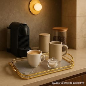 Transforme seus momentos em verdadeiras experiências de luxo com esta bandeja sofisticada com alças douradas. Elegante e versátil, ela é perfeita para servir bebidas em ocasiões especiais, compor uma mesa refinada ou até decorar sua casa com charme e requinte. O design moderno aliado ao acabamento delicado valoriza qualquer ambiente, seja em recepções formais ou encontros descontraídos. Mais do que um item funcional, é uma peça de decoração que transmite bom gosto e estilo. Surpreenda seus convidados com a combinação ideal entre praticidade e sofisticação. Esta bandeja é o detalhe que faz toda a diferença na sua mesa posta Especificações Técnicas Material: PET 345g e PP 20g Medidas: 37,5cm x 26cm Alças: Douradas Metálicas com acabamento delicado Design: Transparente com detalhes texturizados Imagens ilustrativas.