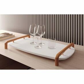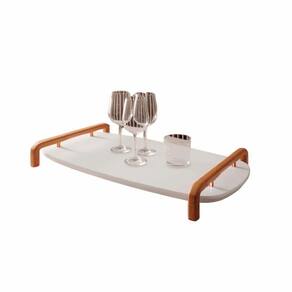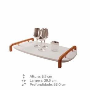 Bandeja Barcelona Decorativa Branco com Detalhes em Metal Cobre A bandeja Barcelona é versátil, pode ser posta para decorar e apoiar objetos sob móveis na sua sala de estar, sala de jantar, quarto etc. Além de agregar na decoração do ambiente. Pode ser utilizada para servir seus convidados em seus encontros sociais. Outra dica de uso, já que a bandeja possui uma estética mais formal, é em escritórios, também para servir ou apoiar materiais de trabalho. Especificações - Medidas do produto: 8,5 (A) x 29,5 (L) x 58(P) cm; - Cor: Branco; - Com detalhes em metal cobre; - Material: MDF Laqueado, Metal e Madeira Tauari; - Peso do produto: 2,15 kg. NA