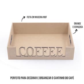 Bandeja cafe coffee café decoração 35x25 madeira mdf Cor: cru Bandeja versátil e multiuso coffee: Feita em mdf de 6mm, ela é ideal para organizar e decorar o seu cantinho especial do café, servir um cafezinho para os amigos, organizar papeis de escritório entre diversas outras utilidades.