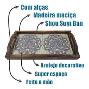 Bandeja produzida em madeira maciça rústica com acabamento de queima japonês shou sugi ban que protege a madeira da ação do tempo e de insetos, proporcionando brilho e realçando a beleza natural da madeira.