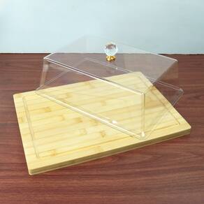 Bandeja em bambu com as laterais profundas para encaixe da tampa em material acrílico e pegador em detalhes que remetem ao Crystal. Ideal para servir bolos, tortas e demais alimentos, além de servir como uma belíssima tábua de frios proporcionando a cobertura dos alimentos para que os mesmos não fiquem expostos a insetos ou poeiras que possam entrar em contato.